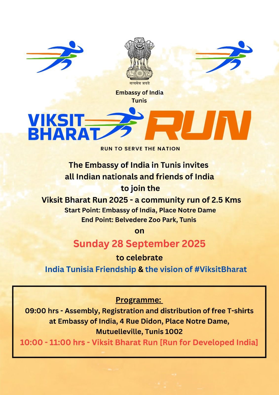 وتتوج هذه التظاهرة التي تقام يوم الأحد 28سبتمبر، بسباق لمسافة تقريبية تبلغ 2.5 كيلومتر، انطلاقاً من سفارة الهند وانتهاءً بمدخل حديقة الحيوانات بالبفيدير، ابتداءً من الساعة العاشرة صباحًا بمقر سفارة الهند، وينتهي حوالي الساعة الحادية عشرة صباحًا ...